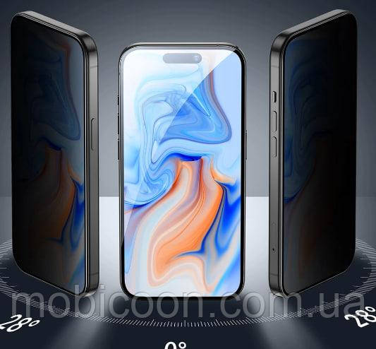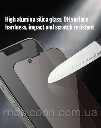 Захисне скло для iPhone 15 Pro Антишпигун забезпечує високий рівень захисту поверхні екрана від механічних пошкоджень під час ударів та падінь, що виникають у процесі експлуатації. Скло має закруглені краї, воно менш схильне до відклеювання і сколів, також ним набагато приємніше користуватися.